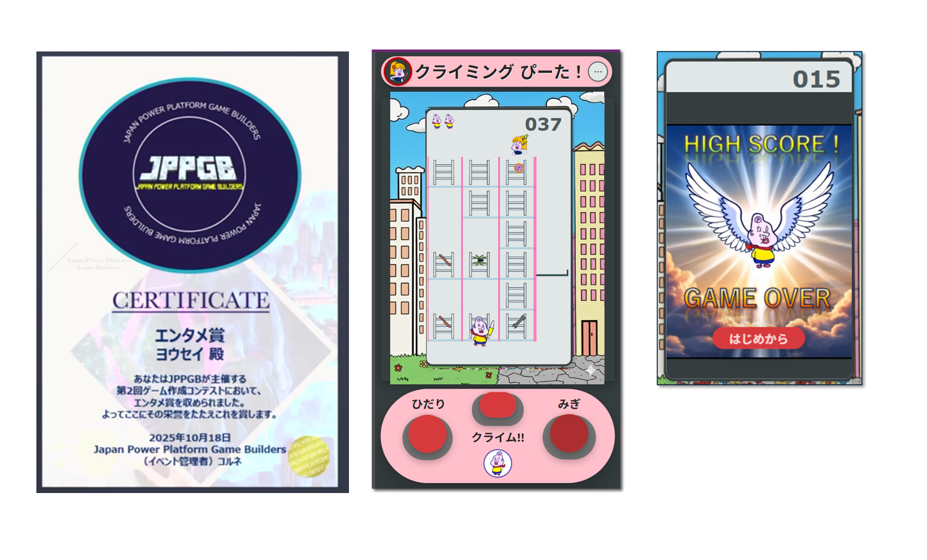 遅ればせながら、今年の10月に行われた、JPPGB(Japan Power Platform Game Builders)のゲーム作成コンテスト#2にて「クライミング ぴーた!」というゲームをPower Apps キャンバスアプリで作成してエンタメ賞をいただきました!