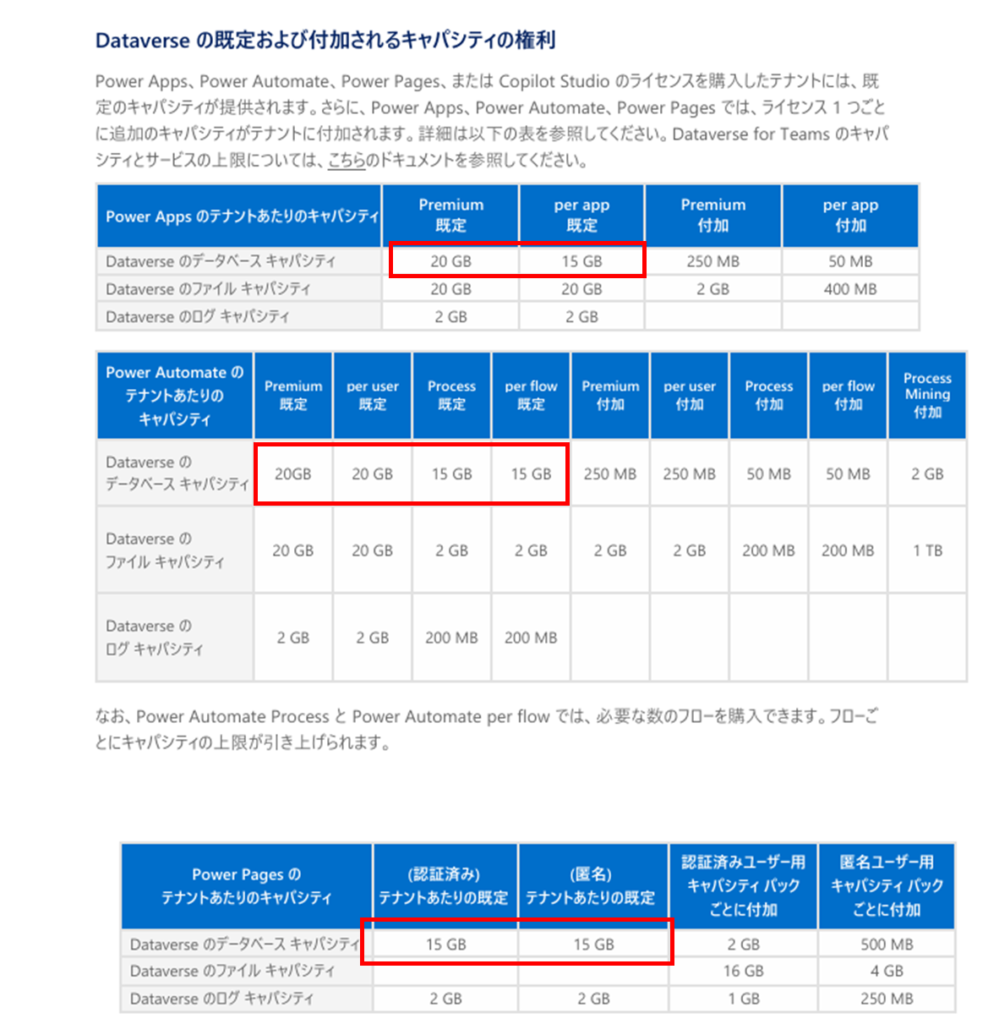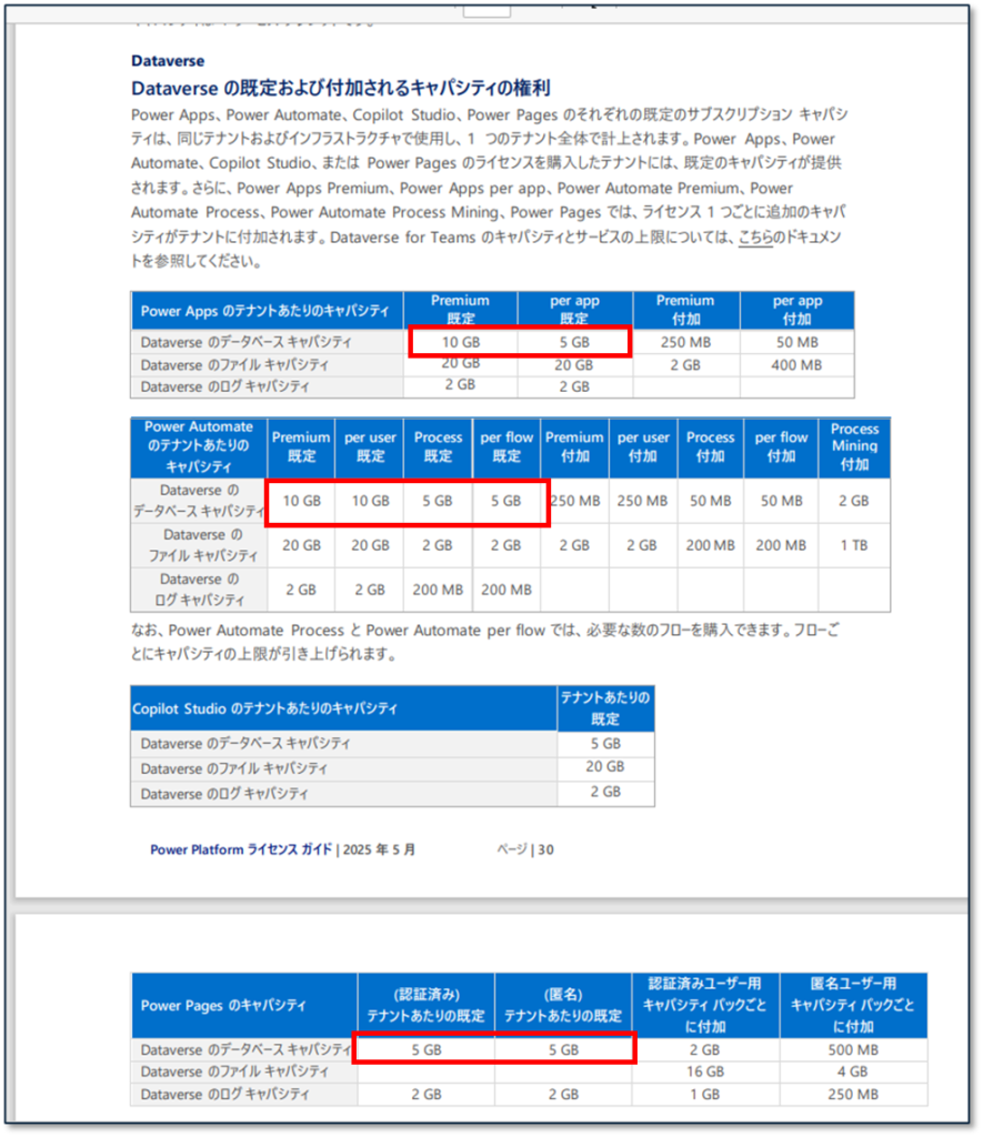 2025年12月のライセンスガイド上で、この既定でテナントへ付与される容量(ベースライン)が10GB増加されておりました! Premiumでは10→20GB、per app は5GB→15GBにという感じです。もちろん Power Automate、Power Pagesも同様にアップしておりました。
