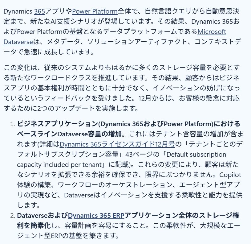 容量増加の背景にはDataverseにて裏側の仕組みを含め情報を管理していく上で、昨今のAI支援機能や多機能化した各種情報の保持において、従来より多くのストレージが必要とされている状況があるようです。
