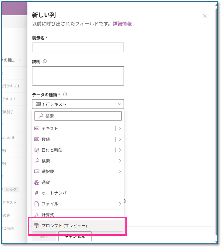 テーブルの設定画面で「新しい列」をクリックし、データの種類のプルダウンで一番下にある「プロンプト列(プレビュー)」を選択します。