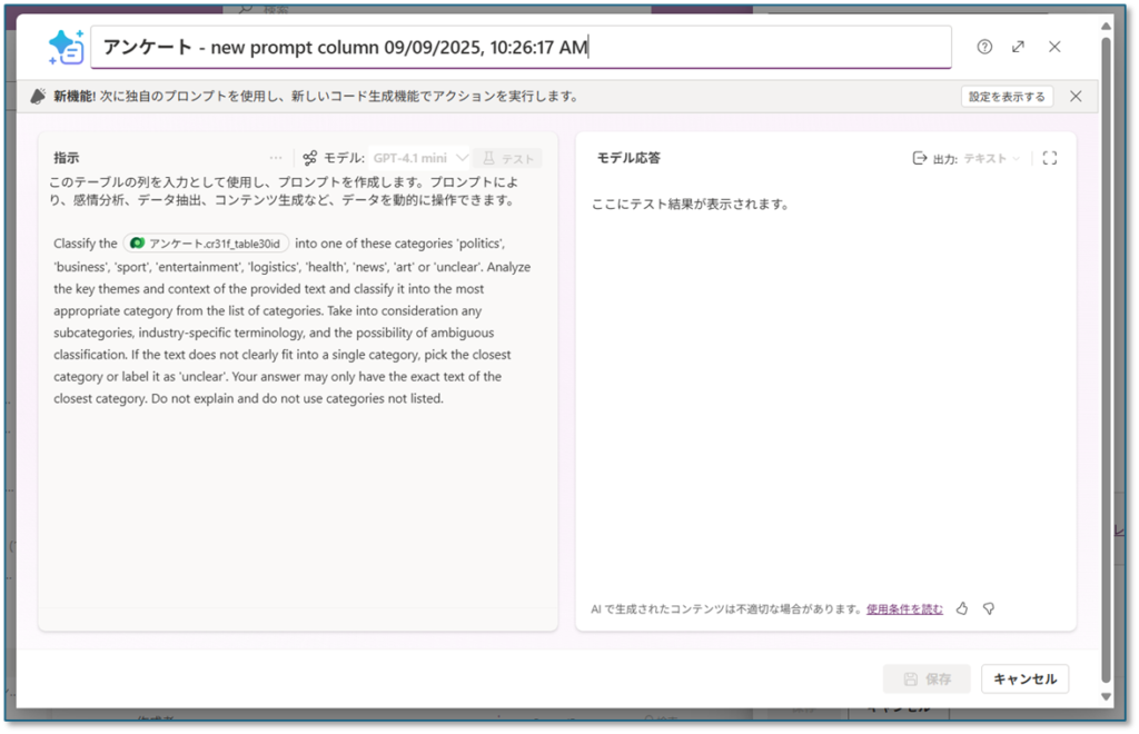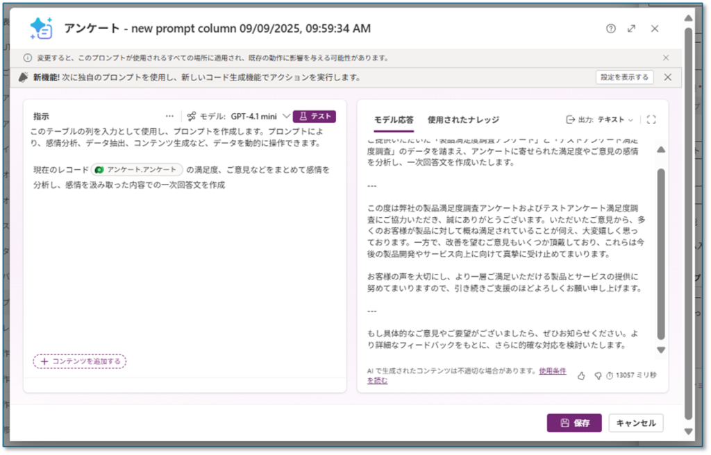他にもモデル駆動型アプリで動作するCopilot(生成AI)の機能が多数プレビュー・GAされていますが、この機能はAI Builder同様にプロンプトで生成される回答の列を作れる。という感じです。