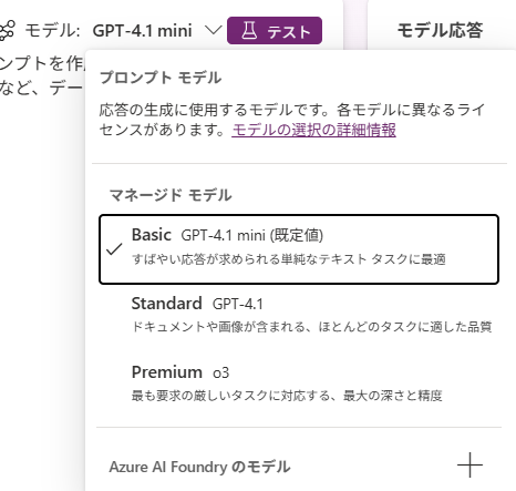モデルの調整が可能です。現時点ではGPT-4.1 miniが既定値でGPT-4.1や03、Azure AI Foundryからモデル追加して選択が可能です。そのうちにGPT-5などになるんだろうと思います。