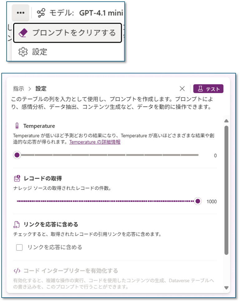 …メニューをクリックするとプロンプトのクリアと設定が表示されます。設定ではTemperatureやレコードの取得件数の設定ができます。