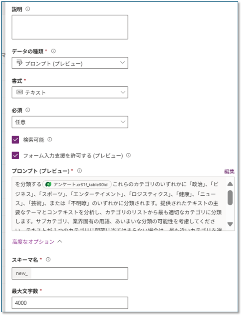 その他の設定ですが、プロンプト列を選択すると書式はテキストで固定、最大文字数は4000文字となっています。