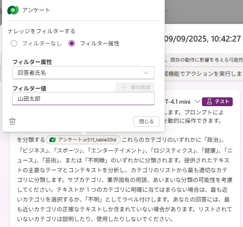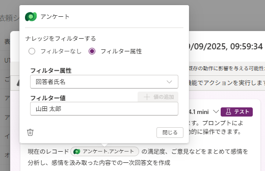 テストをクリックすると記載したプロンプトの内容で結果が表示されます。こちらで事前に回答内容を確認することができます。テスト時は特定レコードを指定するためフィルターを設定して実施するのがよいです。