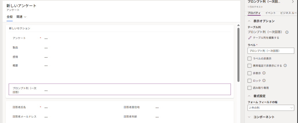 プロンプト列を作成したらフォームに追加します。特にコンポーネントなどの設定は不要です。