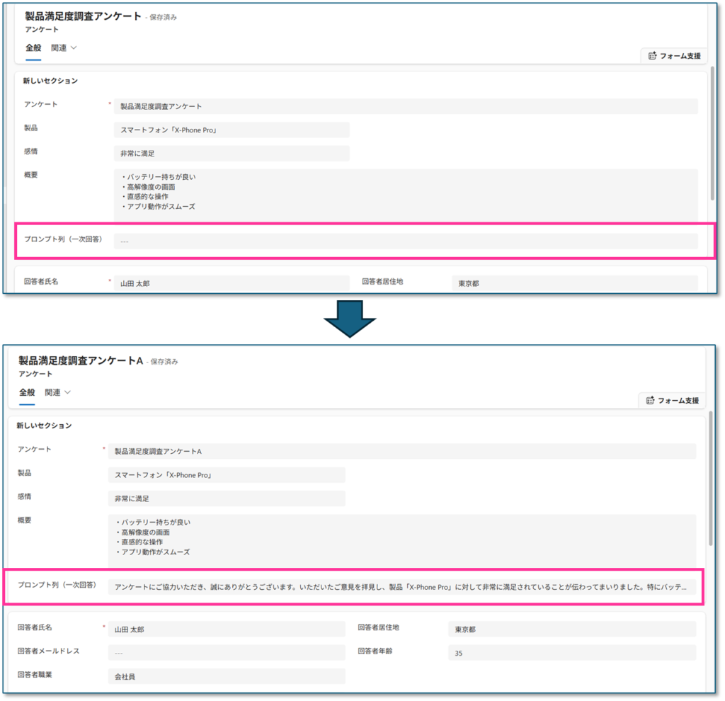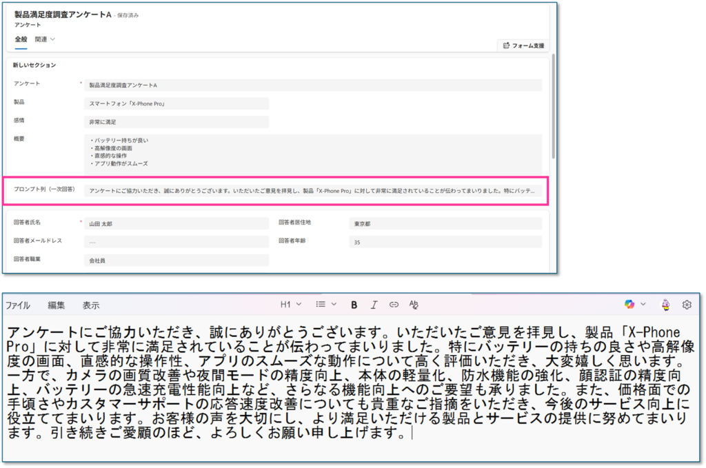 今回はモデル駆動型に追加されたプロンプト列についてご紹介しました。まだプレビュー版のため不明確な部分もありますが、プロンプトビルダーの自動生成内容をレコードに列として設定し、値を保持しておけるという便利な機能です。レコードの内容から自動的に内容を生成してサンプルのような回答例や感情分析しての分類、レコードの要約やデータ分析などいろいろと活用できそうです。