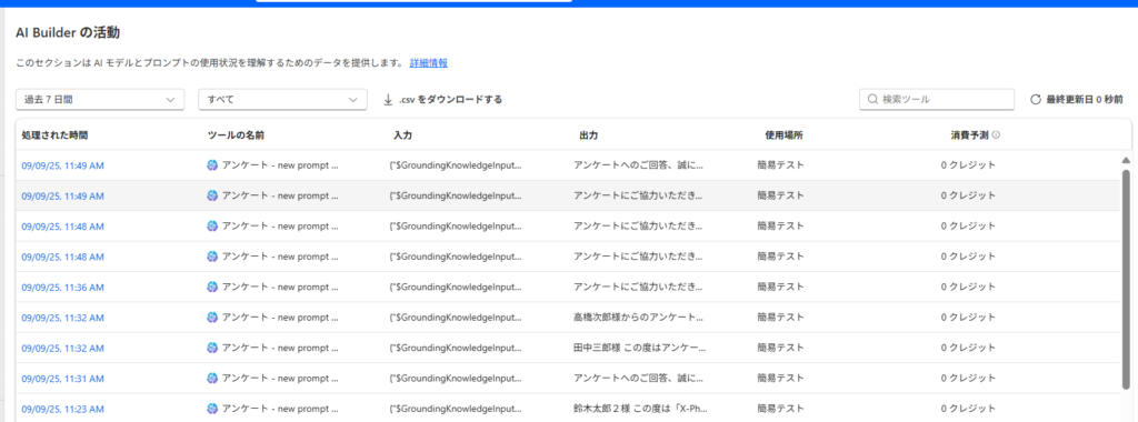AI Builderのクレジットはプレビュー現時点では0の様子(テスト環境だからかも?)