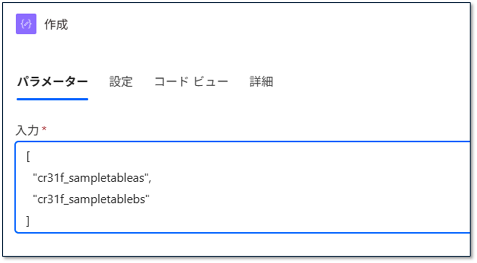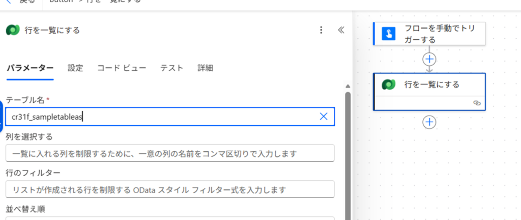 cr31f_sampletableas」(サンプルテーブルAのセット名)を指定して保存、実行します。
