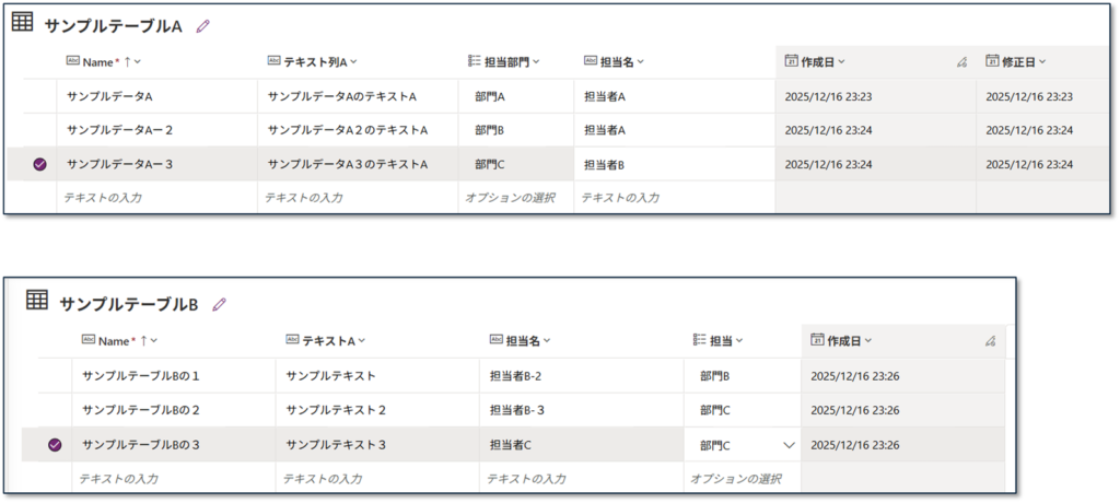 参考までにサンプルテーブルAとサンプルテーブルBには以下のようなデータを入れています。