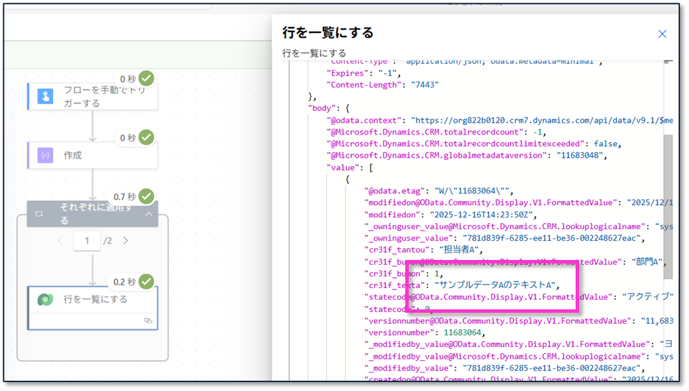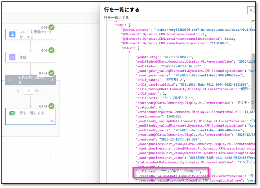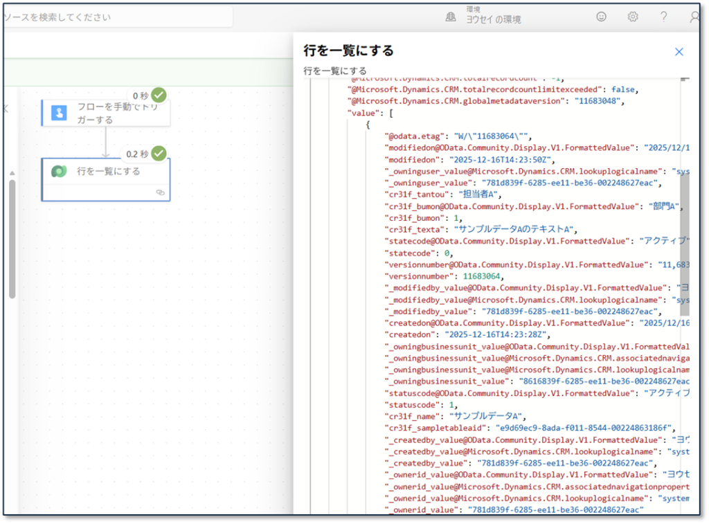実行すると以下のようにサンプルテーブルAのデータが取得できます。また、アクションのテーブル名のプルダウンも自動的に表示名になっています。