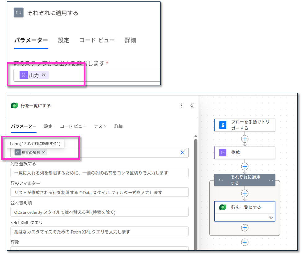 変数や配列にセットして使用する。Apply each で2つのテーブルから取得してみる