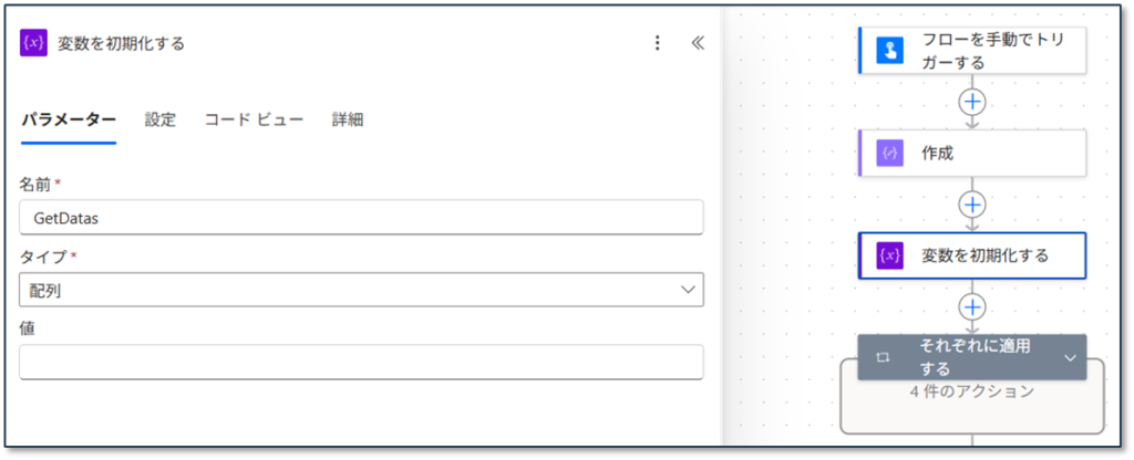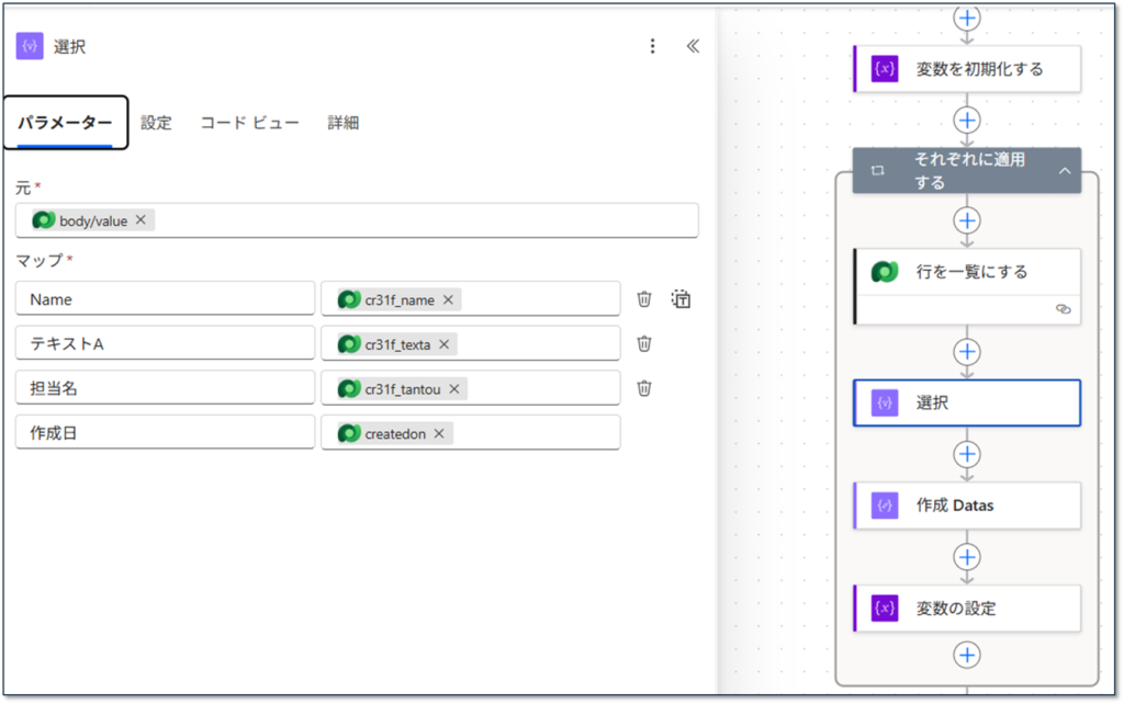 この配列を使ってApply eachでテーブル名に値をセットします。