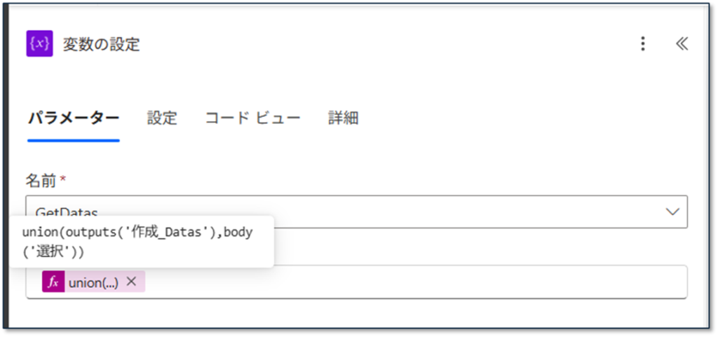 GetDatas変数の設定で 今回の選択アクションの中身と退避したデータをUnionで結合