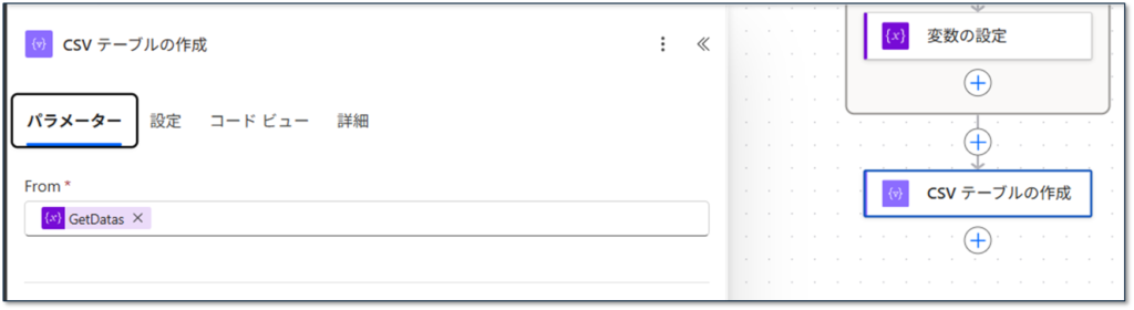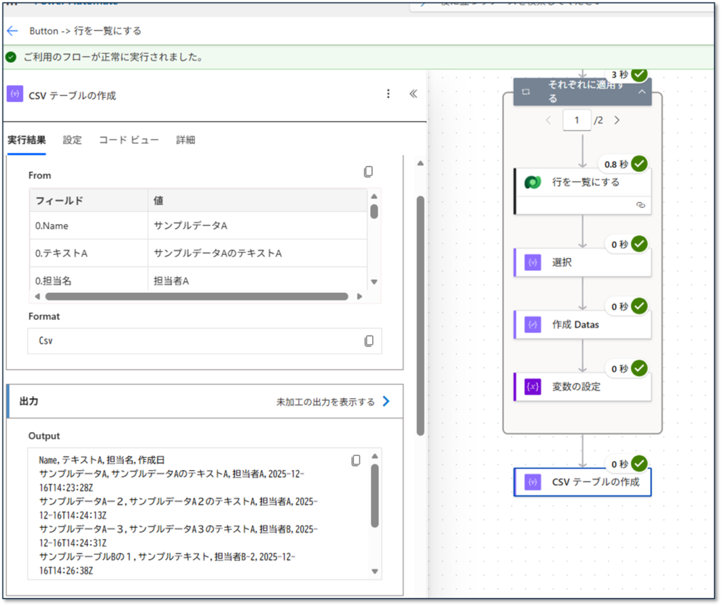 サンプルとして、2つのテーブルに共通の内部名で作成している「Name」や「担当名」、作成日などをCSVアクションでまとめてみたサンプルです。